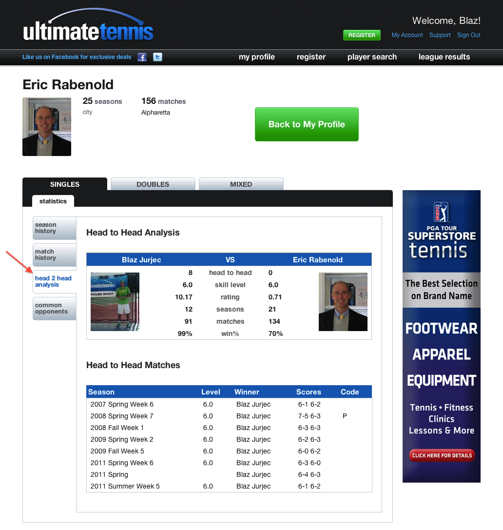 Review comparative head to head stats between you and anyone in the league by clicking a player's name and then the head to head tab. Note - you must be looking at another player to view head to head or common opponent stats.